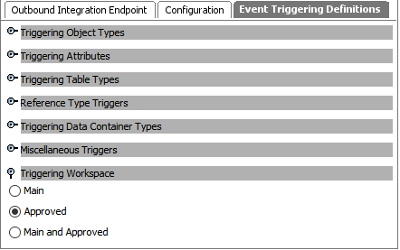 Important: Triggering from the 'Main' or 'Main and Approved' workspace can negatively impact performance and is not generally recommended for OIEPs. An alternate approach to triggering events from the main workspace is to use Derived Events to trigger objects after a group of changes are made by a user or integration / import.