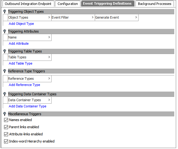 For event-based OIEPs or EPs, the Event Triggering Definitions tab allows you to add or edit the available triggers. At a minimum, you must set an Object Type trigger before the OIEP or the EP can be enabled to queue events. Additional triggers can be added to further limit the data monitored by the OIEP. For more information, refer to the section for each trigger below.