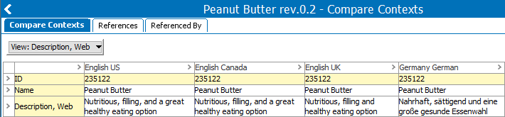 The <ContextID> tag has been added to the export along with the <QualifierID> tag, and each value—including inherited values—is explicitly exported. This means that the 'English Canada' (Context3) values are included in the export, even though it inherits from the master context. If the value is overwritten in the English Canada context, as shown below, the <QualifierID> changes to the ID of the 'Canada English' language dimension point.