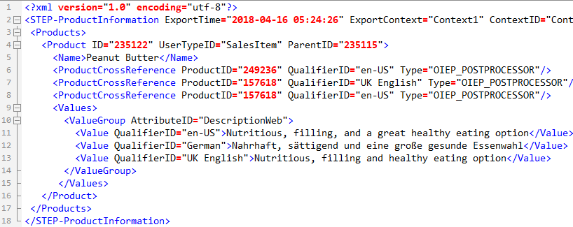 Only the attribute values specific to particular dimension points—indicated by QualifierIDs—are exported, and only the attribute values that are different from the master context. Master values are taken from the 'en-US' and the English UK values are taken from 'UK English.'