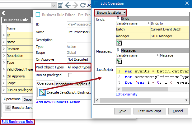 In this example, the target products that are referenced via the Accessory Reference type are included as part of this event. The Execute JavaScript business action is used in conjunction with the Current Event Batch and STEP Manager binds so that any additions, removals, or modifications to the target products are published as part of the source product event. For information, refer to the Business Action: Execute JavaScript topic in the Business Rules documentation, the Event Handling Binds topic or the STEP Manager Bind topic of the Resource Materials online help documentation.