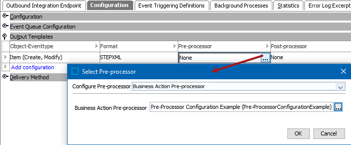 By default, no pre-processor is included in an OIEP output template. Applying the Business Action Pre-processor means a business rule can be run against the data, prior to the export. For example, a node can be added to a current batch, or an event can be removed from the current batch before a message is created for an export.