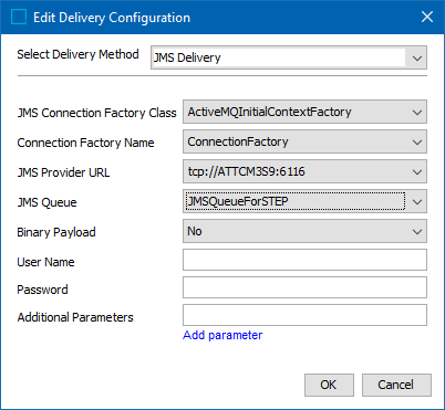 The available options for the Java Message Service (JMS) delivery method are system dependent. STEP has the following standard JMS delivery options: Apache Active MQ and Oracle AQ. Each of these can be used to deliver messages to a JMS Receiver without any further customizations. To deliver messages to other JMS providers, contact Stibo Systems for further customizations. This delivery option is only available in OIEPs.