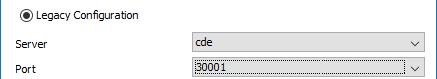 Click the Legacy Configuration radio button to display the Server and Port dropdowns entries for the MongoDB.Server and MongoDB.Port properties.