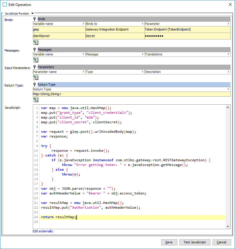 The following screenshot shows the editor for a compatible business function that retrieves a token using the OAuth 2.0 client credentials flow and passes the token back to the delivery plugin as a value for the Authorization header.