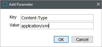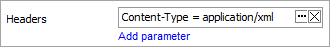 On the Add parameter dialog, click the OK button and the Header is displayed in the field. If multiple headers are needed, use the Add Parameter link to add each additional key and value pair.