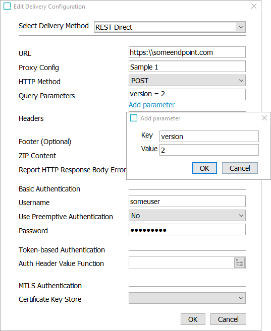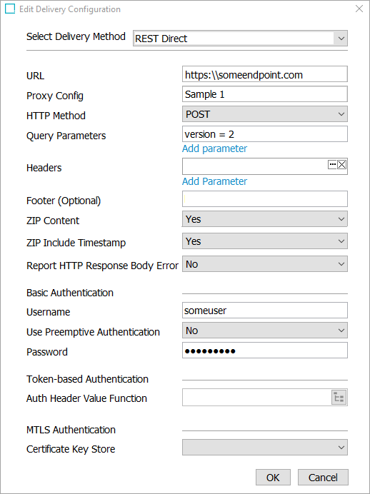 The REST Direct delivery plugin supports both basic authentication, token-based authentication, and mutual authentication.