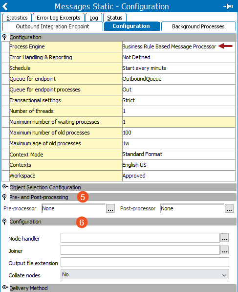- In the OIEP editor, when using the Business Rule Based Message Processor process engine, specify the pre- or post-processors (if any) as described in OIEP - Event-Based - Pre- and Post-processing Section.