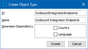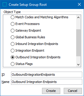 - In the Create Setup Group Root dialog, select the outbound integration endpoints object type, enter an ID and a Name, and click Create.