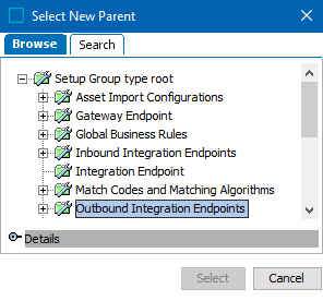 - In the Select New Parent dialog, select the setup group you created, and click Select to make it a valid parent.