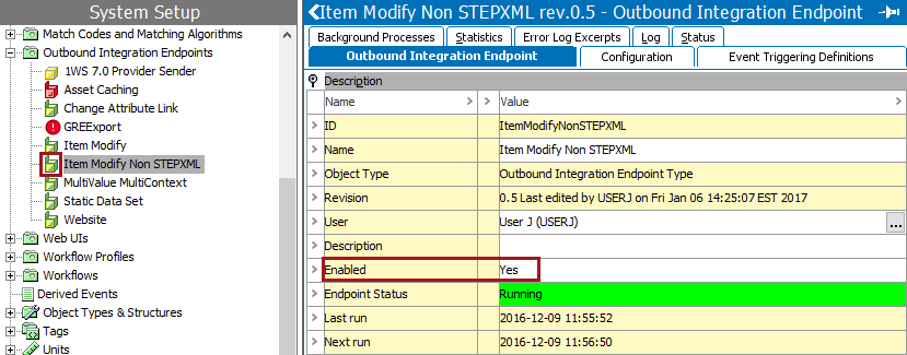 enabled. On the Outbound Integration Endpoint tab, the Description section includes the 'Enabled' parameter, which now displays 'Yes.'