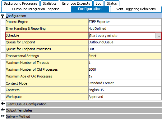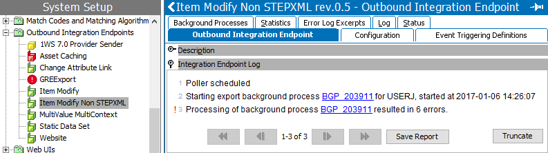 When invoked on schedule and manually, files or messages ready for export as identified by the OIEP configuration are processed. The Outbound Integration Endpoint tab Integration Endpoint Log section displays the time the endpoint was invoked. For scheduled OIEPs, the log includes a link to the background process that was started. For more information, refer to the Maintaining an Outbound Integration Endpoint topic.