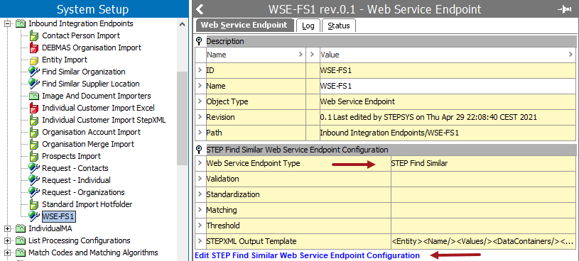On the Web Service Endpoint object, open the STEP Find Similar Web Service Endpoint Configuration section and verify the 'Web Service Endpoint Type' is set to 'STEP Find Similar'. The type cannot be changed, if necessary, create a new web service endpoint. For other types of endpoints, refer to the configuration options defined in the Web Service Endpoints topic.