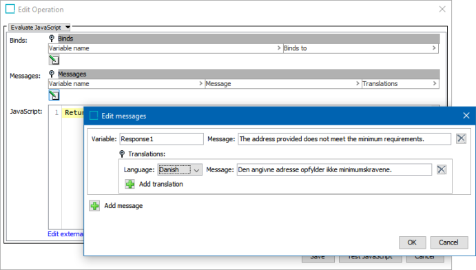 When sending a web service request, the request includes the current context. This request is sent to STEP and STEP returns a value with the context language included. If the 'Evaluate JavaScript Business Condition' fails, the included context signals which translation of the business condition message to include.
