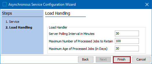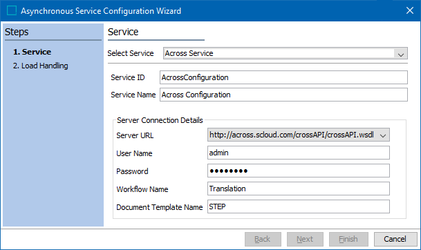 2. In the Asynchronous Service Configuration Wizard, complete the parameters on the Service step based on the required service:
