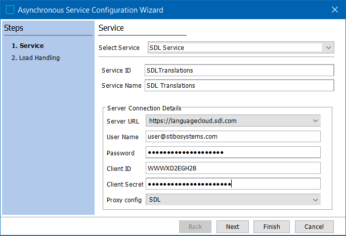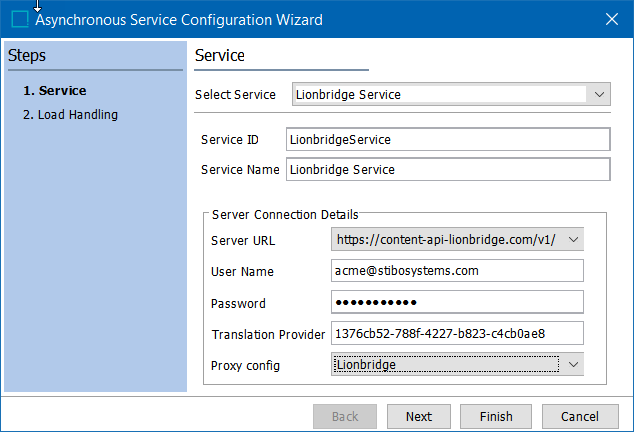 • For Lionbridge translation service, most of the information in the Server Connection Details of the Service step is provided by Lionbridge. Enter your own values for parameters as demonstrated in the image below: