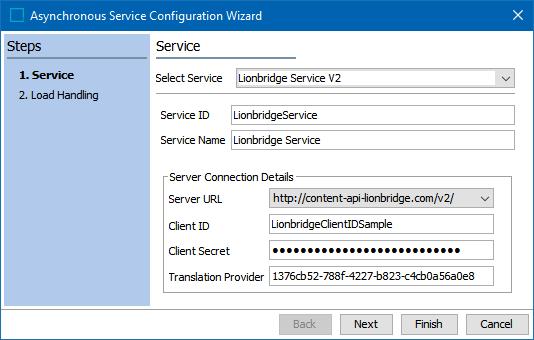 • Select Service - Select the Lionbridge Service V2 for Lionbridge translations