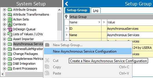 1. In System Setup, right-click the Asynchronous Services root node and select New Asynchronous Service Configuration.