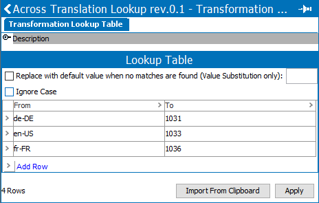 - Windows Language Code Identifier (LCID) - Enter the language IDs in the 'From' column and the corresponding ISO language / country qualifier in the 'To' column as shown below.