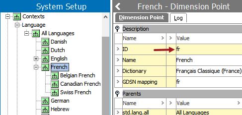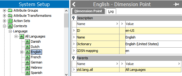 When sending files to be translated, some services require that the ISO-639 language code needs to be sent, followed by the ISO-3166 country code. For example, if a file was being translated from English US to Danish Denmark for SDL Translation, the required language codes would be 'en-US' and 'da-DK.' As shown below, the language dimension point IDs follow the required format, so a transformation lookup table is not required.