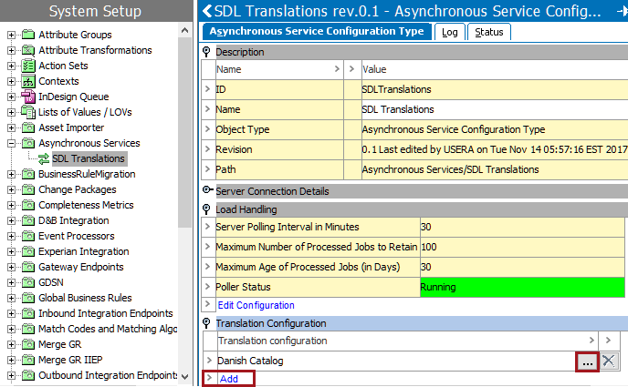 - In System Setup, select the asynchronous service configuration (named 'SDL Translations' in the image below), and on the first tab open the Translation Configuration flipper.