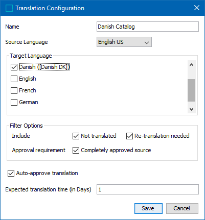 - Auto-approve translation - By default, this option is checked and inbound translation updates are automatically approved and moved to the Approved workspace. When unchecked, inbound translation updates remain in the Main (maintenance) workspace.