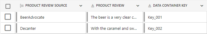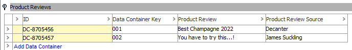 For example, shown in the screenshot below are two data containers of the type ‘Product Review’. They are linked to a product. One has a 'Data Container Key' of '001' and the other '002'.