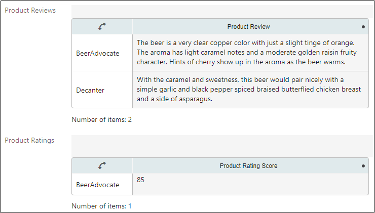 When a PDX user clicks on the ‘Product Reviews’ composite’s details, the data container attributes and their values display in PDX as shown in the screenshot below: