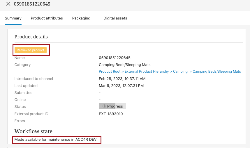 A product that enters PDX in this way will be marked as a ‘retrieved product’ and enter the PDX onboarding process in the workflow state named 'Made available for maintenance in <name of channel>,' as shown in the screenshot below.