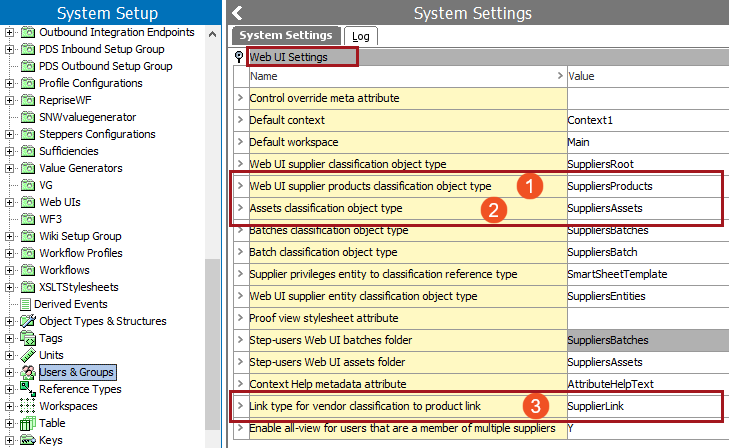 - Web UI supplier products classification object type: This setting specifies the object type of the folder in the supplier classification hierarchy that will be used to store product objects. For this example, the specified object type is Suppliers Products (SuppliersProducts).