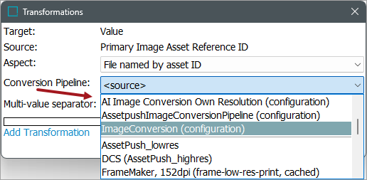 If needed, choose an image conversion configuration from the Conversion Pipeline field and click the Save button. The list displayed includes user created image conversion configurations in STEP. The Source option exports the original asset content, and no conversion is applied.