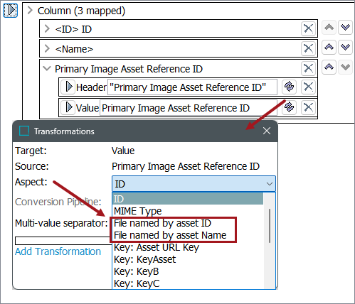 For the Asset Reference Value parameter, click the Transformation button and select the desired file name option for the asset files that will be included in the zipped export file.