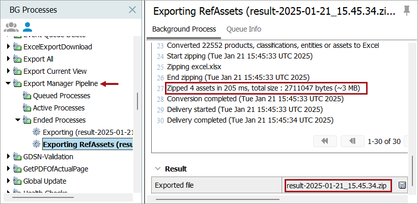 The export file is displayed on the Background Process tab under the Export Manager Pipeline node. The number of assets, the time spent zipping the file, and the total size of the zipped file are listed in the Execution Report section, as shown below.