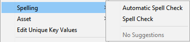The Edit menu allows for typical text editing actions, asset editing actions, unique key editing, and spell check.