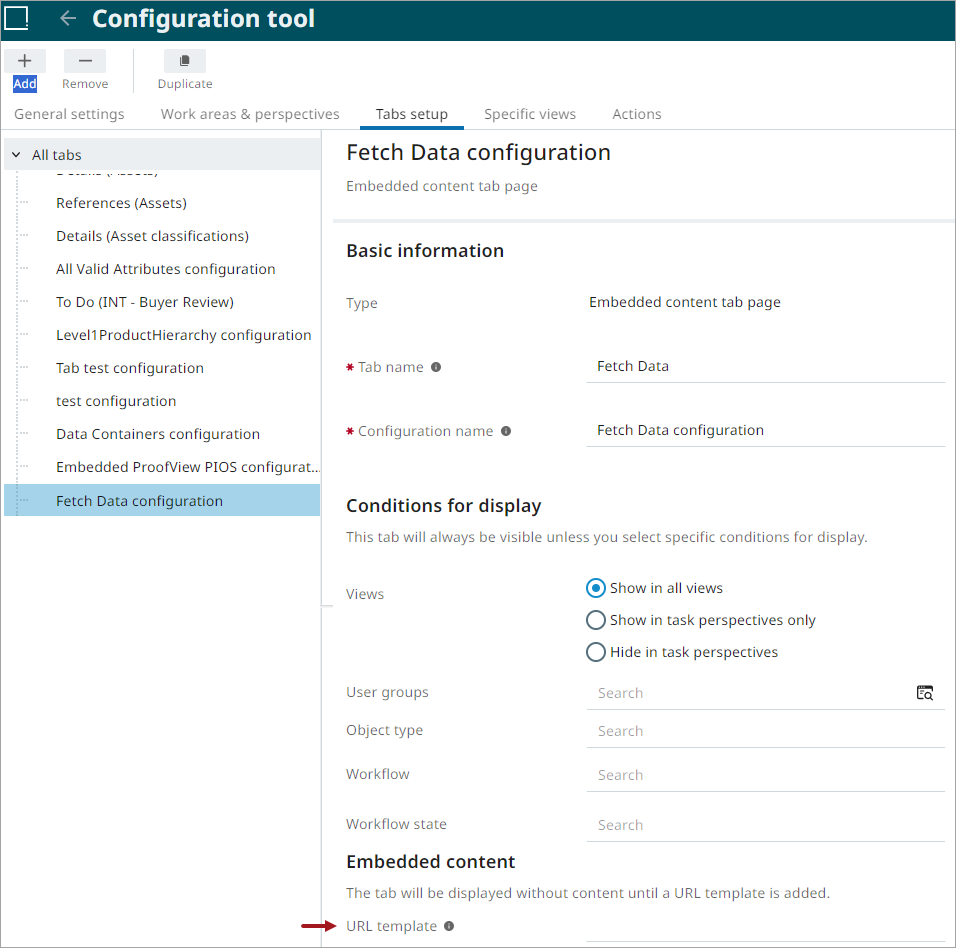 In the Embedded content section, enter the URL template that should be rendered inside the tab.