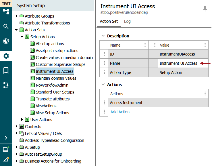 Click on the new action set that was just created (Instrument UI Access) and go to the Action Set tab.