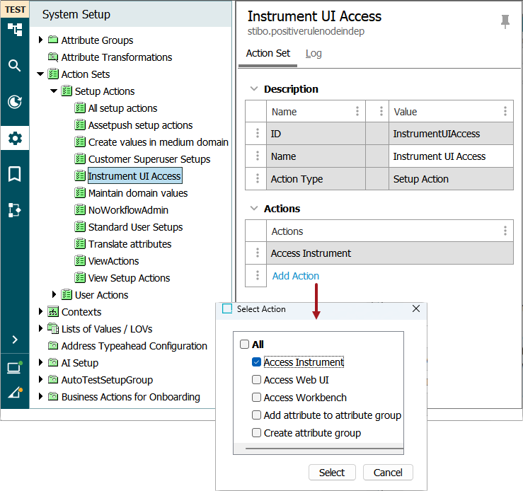 ) next to the Action Set field and choose the Action Set you just created (Action Sets > Setup Actions > Instrument UI Access). Then, click Select.