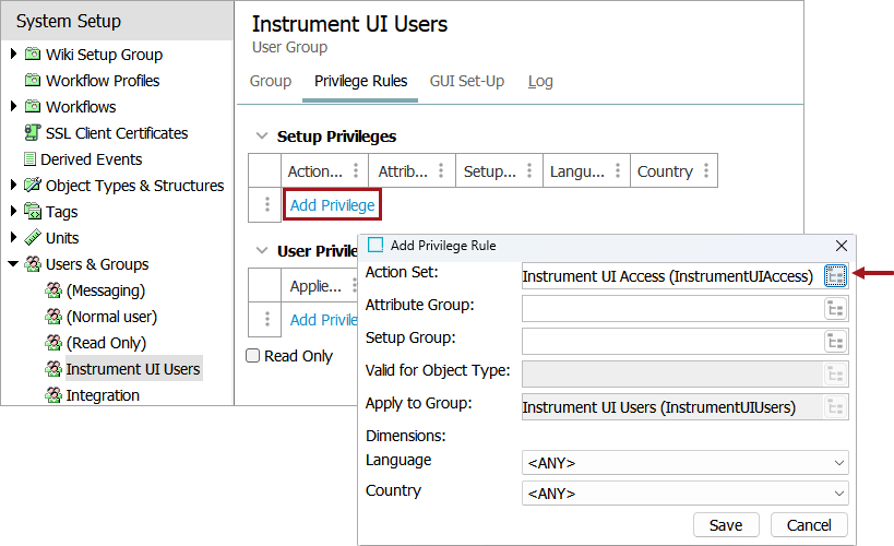 Important: If restricting user access to Instrument UI, make sure there are no competing Action Sets set for the user group. The action set with the most generous access applies, not the Action Set with the most restrictive access.