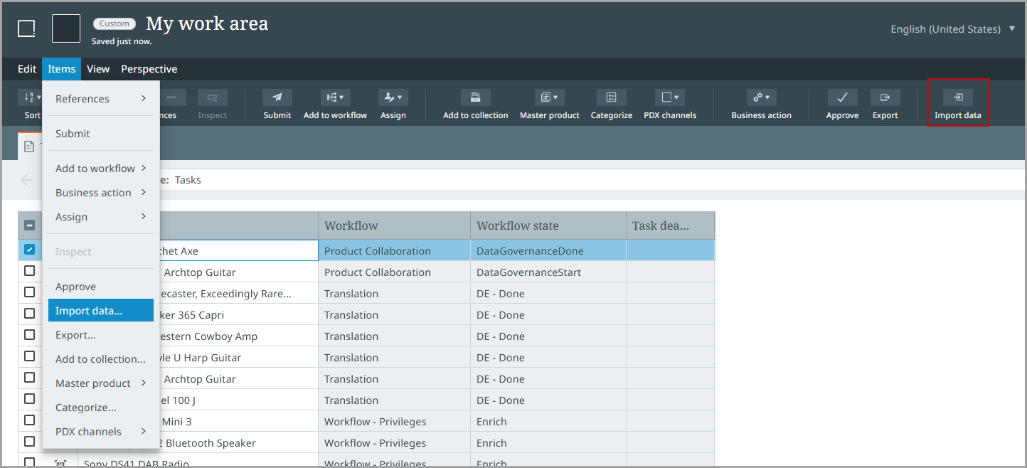 From within a perspective, you can import data using the 'Import data' options available from the toolbar and the Items menu: