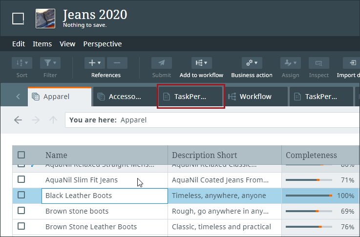 In the 'Tasks' perspective, for example, the 'Details' view shows the details of an item contained in a workflow, thus representing a workflow task. Details for an item in this perspective (shown below) are presented to the user in configurable tabs that can display referenced images and other assets, attributes, attributes groups, languages, and more.