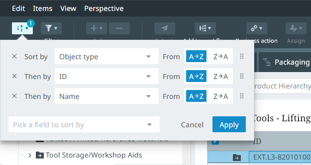 If you configure the perspective to sort by multiple fields, it will sort them in order of appearance on the Sort by list. This order can be changed by dragging and dropping the fields with the drag handles. For example, in the below image the perspective sort priority is Workflows first, then Name, and finally Object Type.