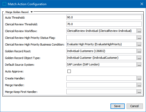Merge Handler - select a business action to run when two golden records are merged. This business action runs after the surviving record has been determined and the record to be deactivated has been merged.