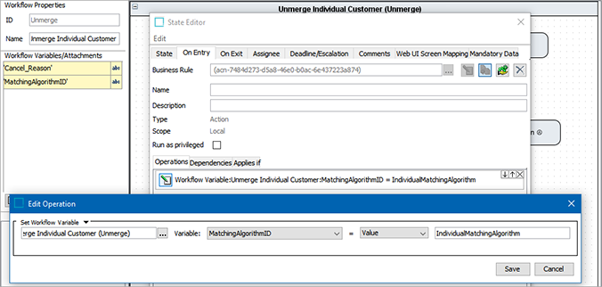 Workflow-based unmerging is intended to add a level of control to the unmerge process by initiating a merged record into the initial state of the unmerge workflow where a knowledgeable user can decide to continue or exit the unmerge process. This workflow setup is optional since users can perform ad hoc unmerge operations, refer to the topic Unmerging Golden Records.