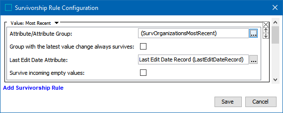 Group with the latest value change always survives - When checked, all values of an attribute group will survive when the group contains the attribute with the most recent timestamp among all compared attribute groups.