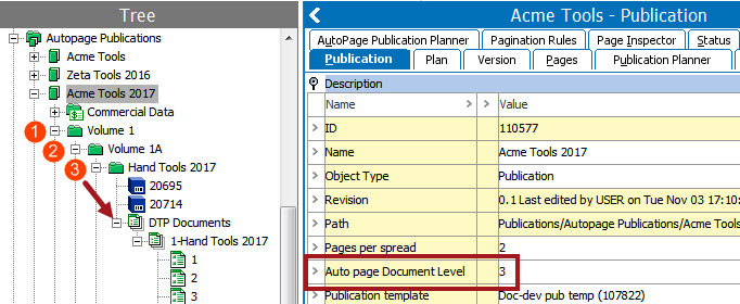 AutoPage publications include an Auto page Document Level setting. This setting determines the section or subsection level at which InDesign documents (actual pages, also known as DTP Documents) are stored. The below screenshot shows the location of an InDesign document stored in a publication with an AutoPage Document Level setting of 3. For more information, refer to the Autopaginating Pages topic.