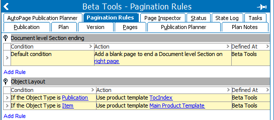 Use the Pagination Rules tab to define and gain an overview of all pagination rules. All pagination rule conditions and actions are displayed, including the location in the publication structure where the rules are defined. For more information, refer to the AutoPage Pagination Rules topic.