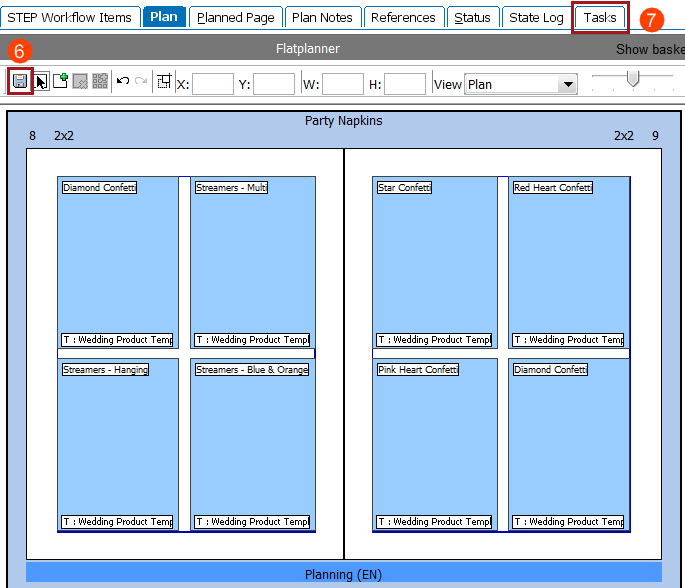 - The planned page spread displays in the Flatplanner on the Plan tab. Plan your page, and then click the Save icon