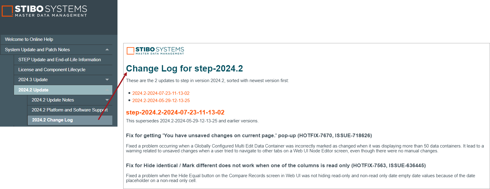 All other users can access the Change Logs directly from the Stibo Systems Service Portal. To view the logs, log in and go to the 'Update Information' dashboard. The Change Log is linked under each update version (for all supported versions of STEP).