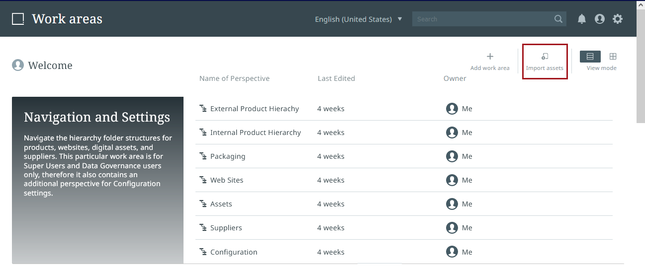 The Stibo Systems' new UI for STEP features a new 'Import assets' button that displays on the Work areas screen. This feature allows for seamless asset imports independent of any specific perspective or product.