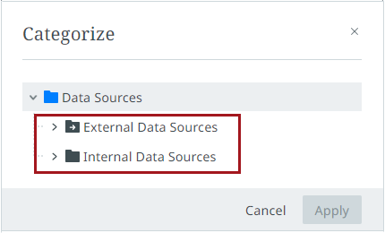 The 'Categorize' button, found in Instrument UIs for Accelerator for Retail implementations, now displays objects in both the External and Internal Data Sources hierarchies when clicked. Previously, only objects in the Internal Data Sources hierarchy would display in the item picker as objects that could be selected and re-categorized.